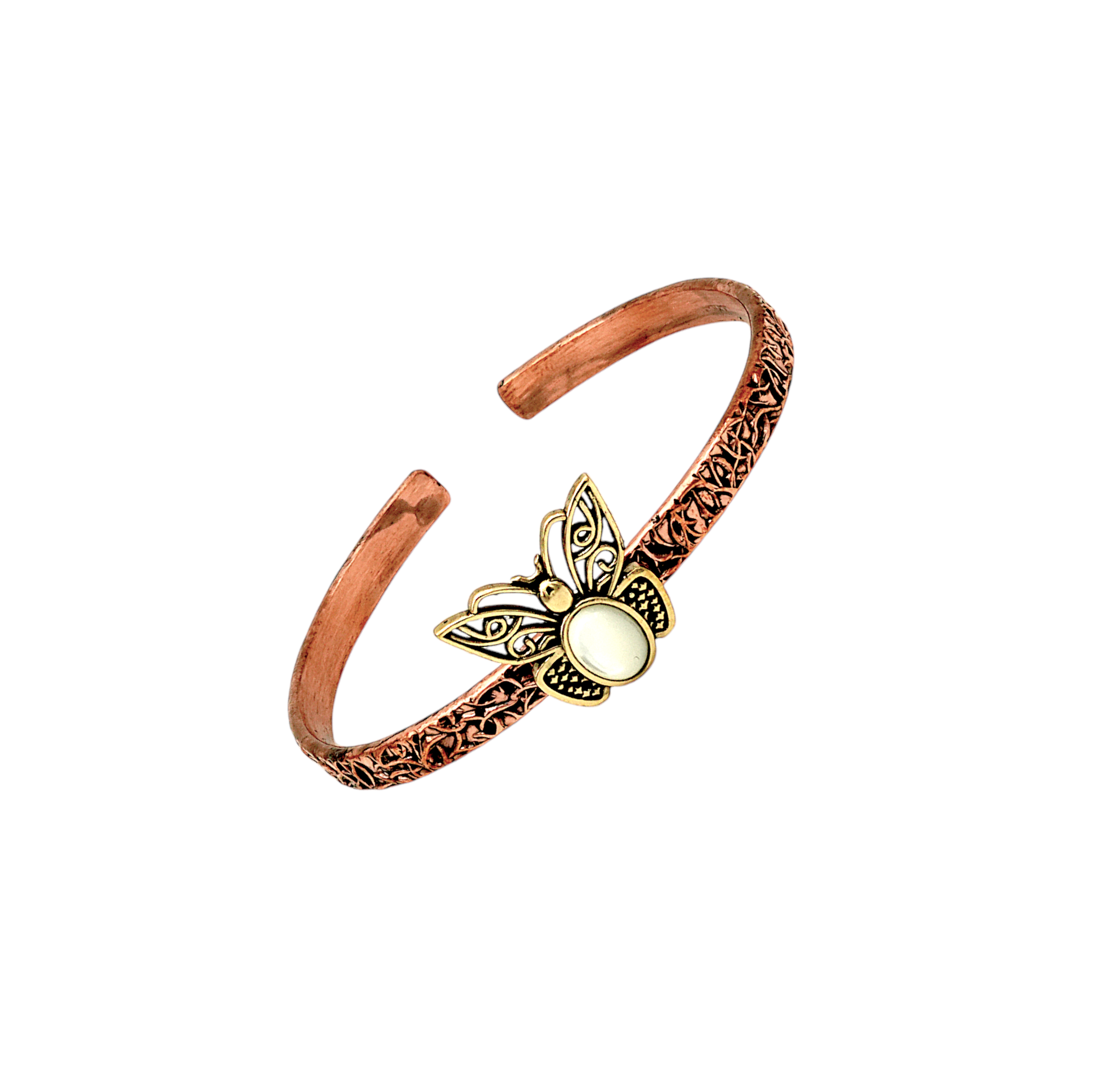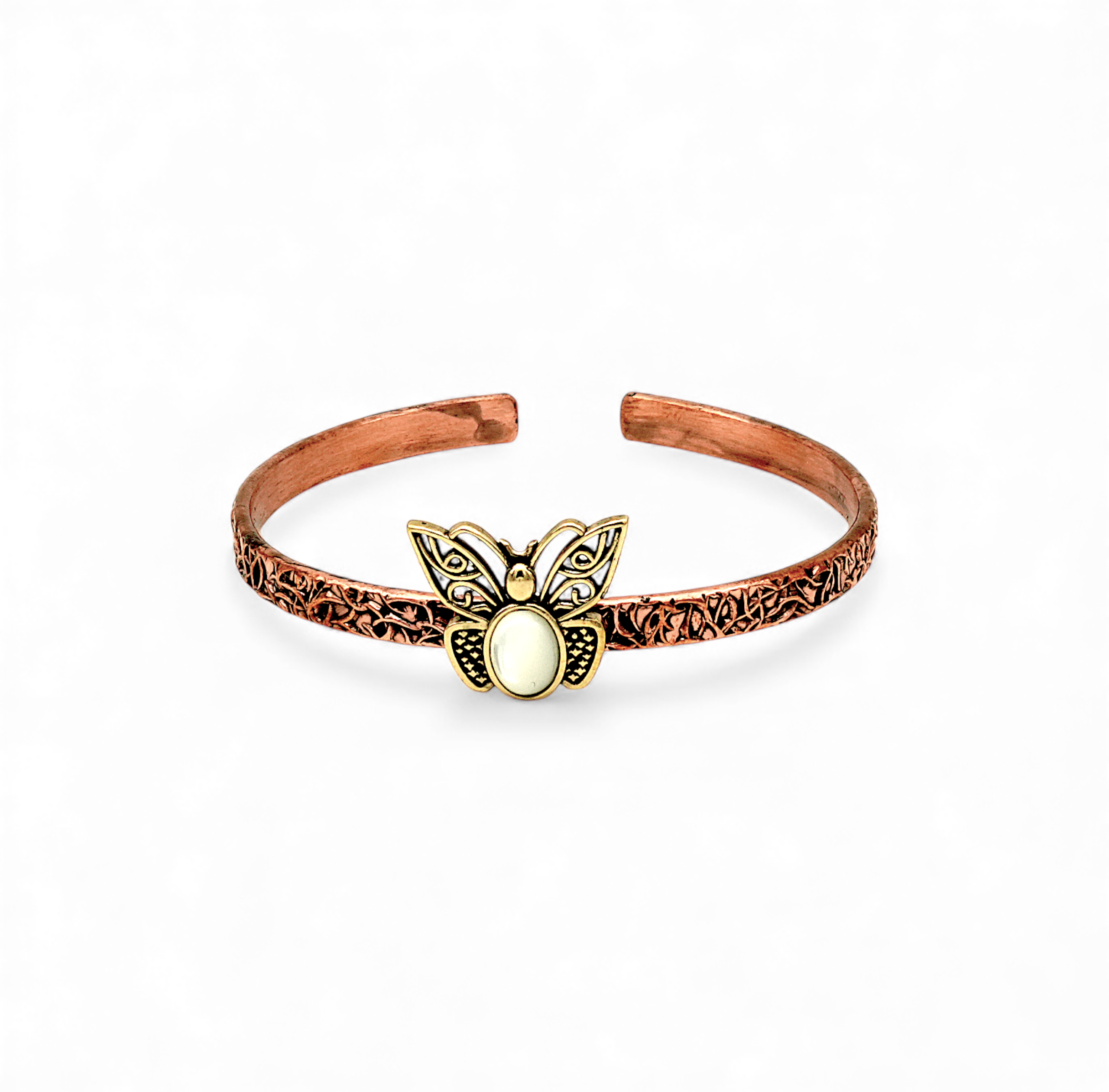 Dönüşüm ve özgürlüğün simgesi kelebek figürü, el işçiliği bakır detaylarla buluşarak zarif ve enerjik bir bilekliğe dönüştü.