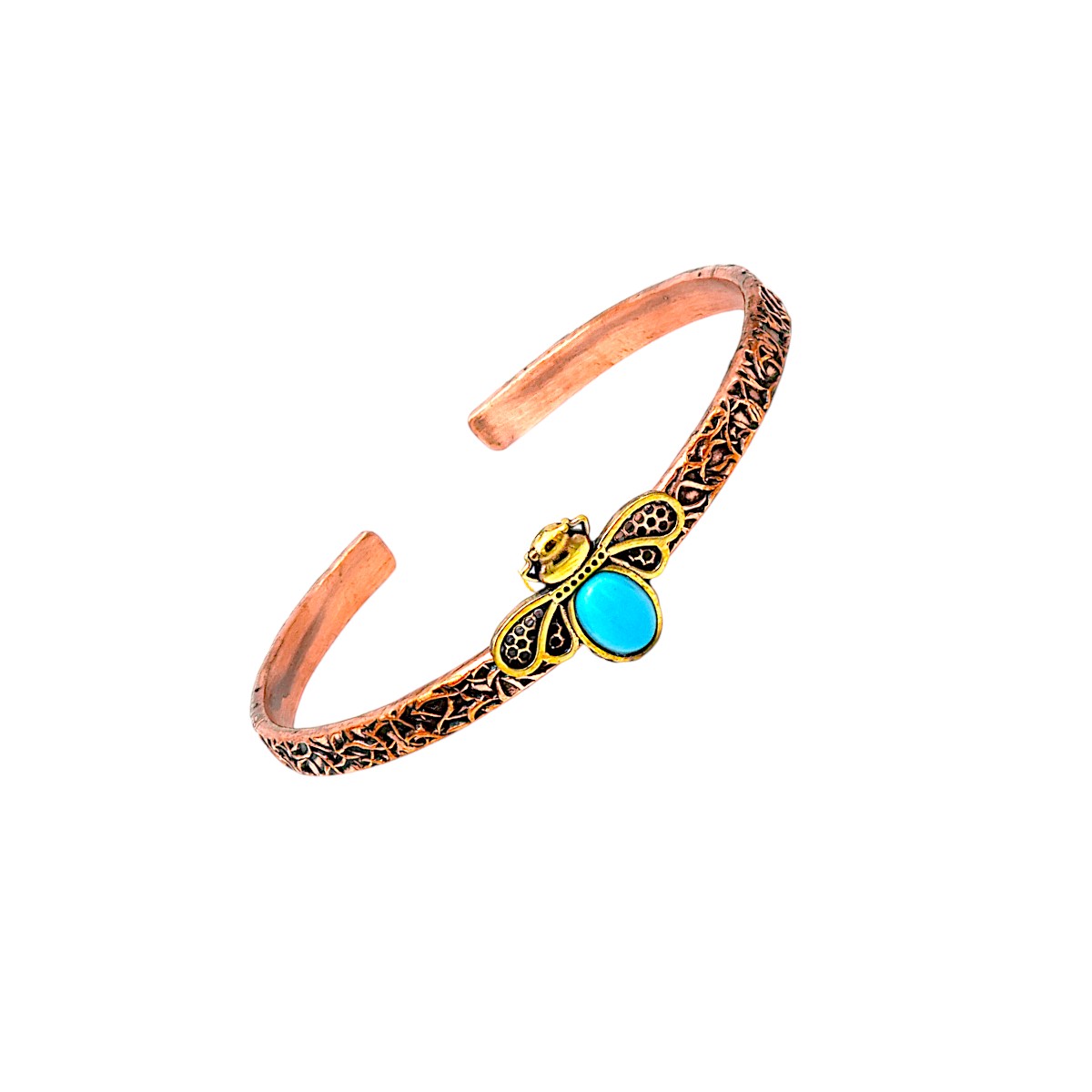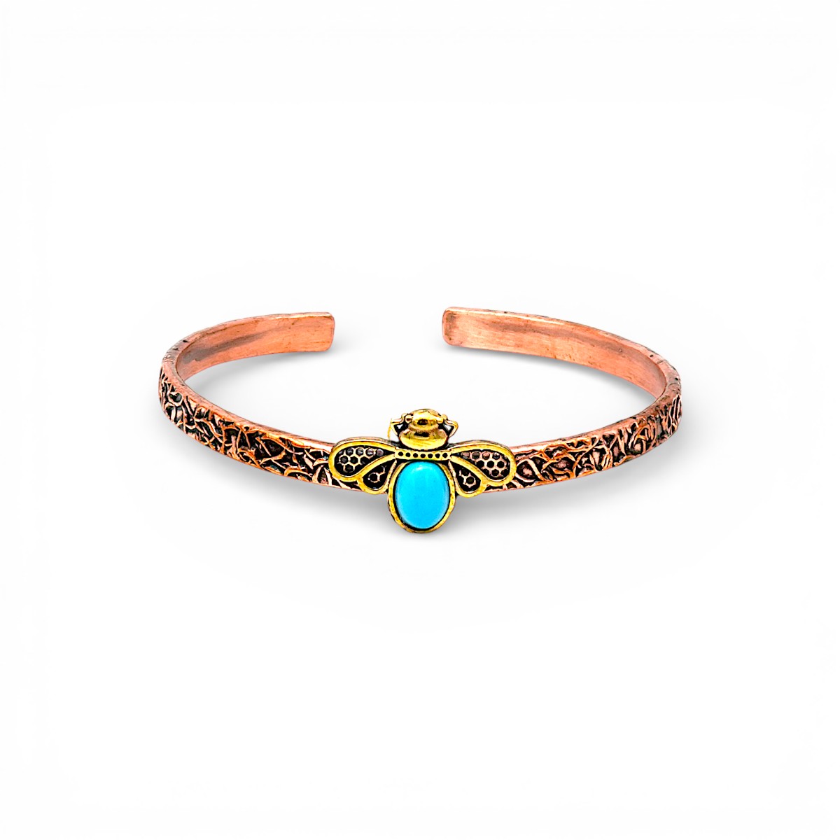 Çalışkanlık ve bereketin sembolü arı figürü, el işçiliği bakır detaylarla anlamlı ve enerjik bir bilekliğe dönüştü.