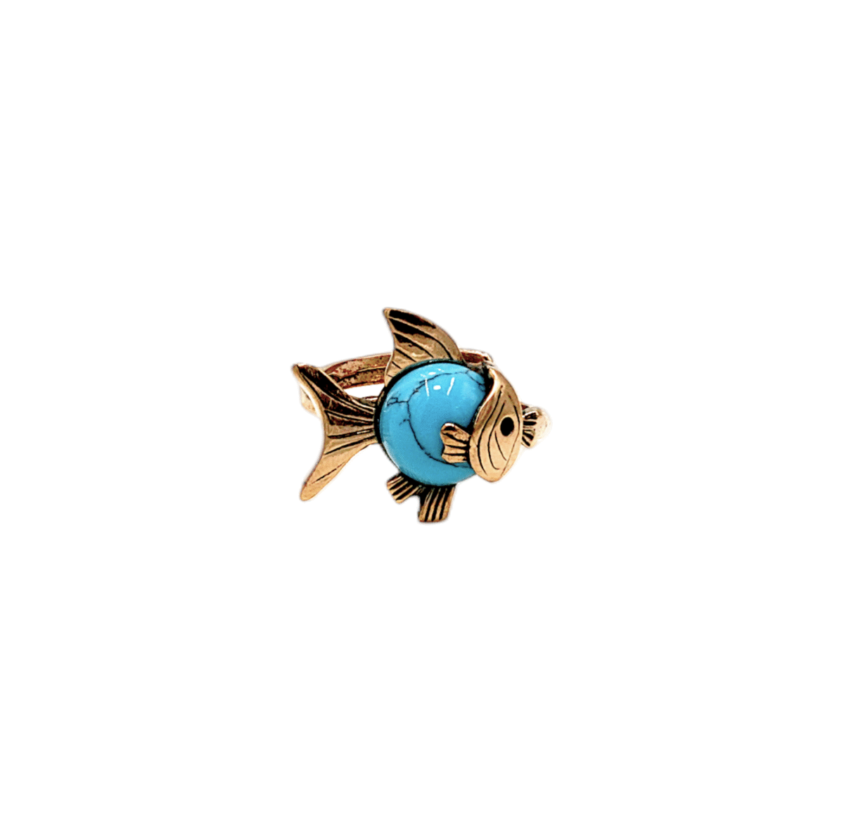 Turkuaz taşının pozitif enerjisi, bronzun dayanıklılığı ve balık figürünün zarif tasarımıyla birleşiyor! Kuyumcu işçiliğiyle özenle hazırlanan bu yüzük, ayarlanabilir yapısıyla her parmağa kolayca uyum sağlar. Estetiği ve dayanıklılığı bir arada sunan bu yüzük, koleksiyonunuza deniz esintili bir zarafet katar.